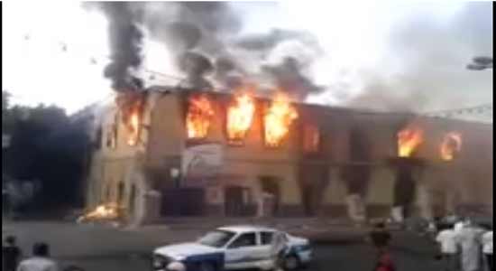 This video has been published on the internet, and shows hundreds of supporters of Egypt's ousted president Mohamed Morsy while torching a Franciscan school and surrounding the building in order to loot it and to prevent fire fighting vehicles from extinguish the fire.