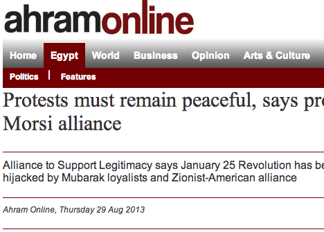 The Egyptian people want to take back their revolution from the “coup” leaders, who are backed by Mubarak loyalists and the Zionist-American alliance, the Alliance said.