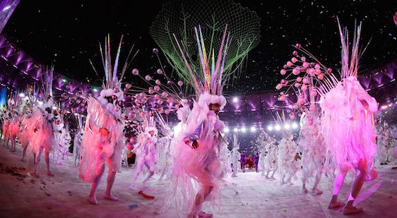 Dressed in colorful feathers, dozens of dancers formed in the shape of the arches of Lapa, a popular area of Rio akin to Roman ruins, then morphed to make the shape of iconic Sugarloaf before quickly changing again, this time to the official 2016 symbol.