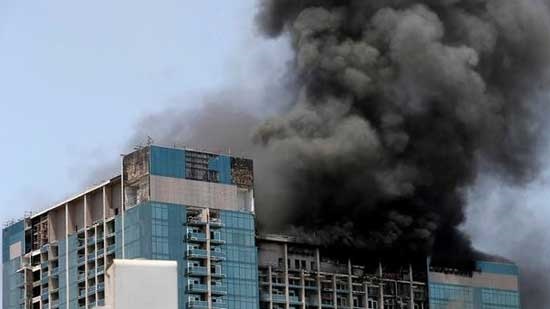 Thick black smoke billowed from the top 20 floors of the almost-completed commercial building in the UAE's capital and firefighters, overseen by helicopters, were working to put the blaze out two hours after it started, witnesses said.