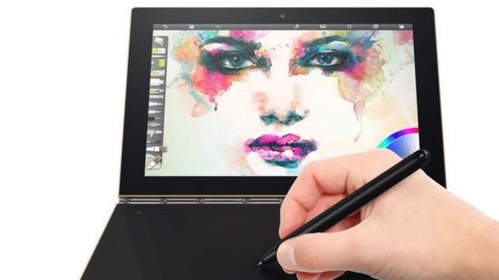 The Yoga Book's unusual fold-out digitiser pad can also be used to create graphics. In addition, it lights up to form a keyboard.