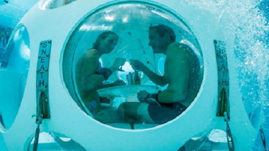 Food is served by expert scuba divers who deliver foie gras, lobster salad and champagne in waterproof cases before leaving the diners peering out of the portholes, enjoying the strange tranquillity of eating in an air pocket, completely submerged.
