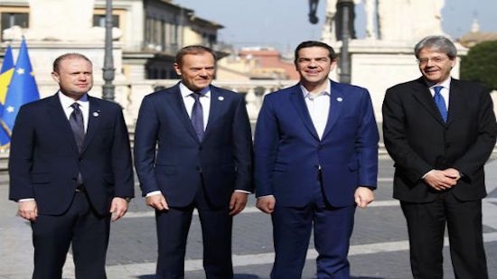 Under heavy security as the Italian capital braced for anti-EU protests and the risk of attacks such as that by an Islamic State follower in London last week, the 27 national leaders gathered in the Campidoglio palace where the six founding states signed the Treaty of Rome on March 25, 1957.