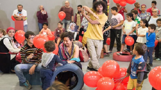 Mohamed El Ghawy, founder and artistic director of Hakawy surrounded by children at the opening of the festival, Hanager Arts Centre, 8 March 2018. (Photo: Bassam Al Zoghby)