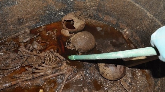 Upon opening the black granite sarcophagus, archaeologists found three skeletons and a red liquid speculated to be sewage water that leaked into the coffin, causing the mummies to decompose according to an Egyptian Ministry of Antiquities report.