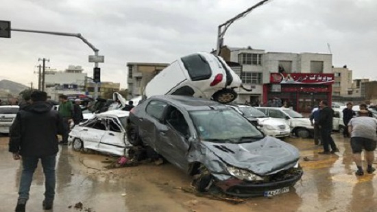 Iranian media showed pictures and footage of crumpled cars piled up deep in mud and water after floods swept through Shiraz. Iran s Students News Agency ISNA said high water had damaged thousands of houses in Shiraz and other towns.