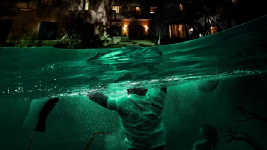 The poster shows bodies submerged underwater along with a musical instrument and a mannequin. Overlooking the water is the facade of an inconspicuous villa, with a dim light emitting from its windows, and all of this is surrounded by a dark background.