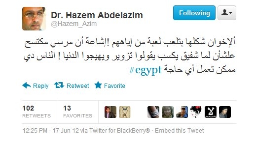 Dr. Hazem Abdul Azim, former Minister of Communications, said on his account on Twitter: Muslim Brotherhood is playing a game to claim elections is fraud if Shafik wins. They are planning to incite people. Those people can do anything.