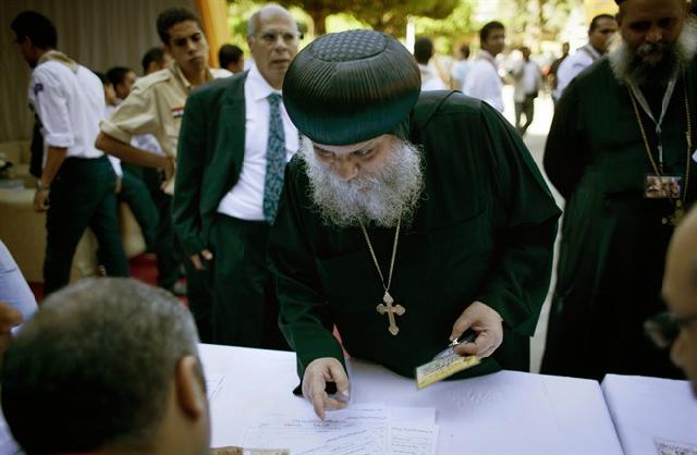 About 2,400 clergymen, community leaders and Egyptian Coptic notables gathered in the main Coptic cathedral in Cairo for the voting — parts of which were shown live on state TV. They were choosing a short-list of three candidates from a field of five monks and auxiliary bishops.