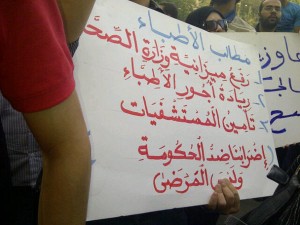 Chants included; “the wolves get the budget while the hospital becomes a ruin,” “the people demand the patients’ rights,” “stadiums are protected with tanks while hospitals are left without gates,” “patients get killed and the minister of health is responsible for their death,” and “the strike is our weapon against a ministry which is slaughtering us.”