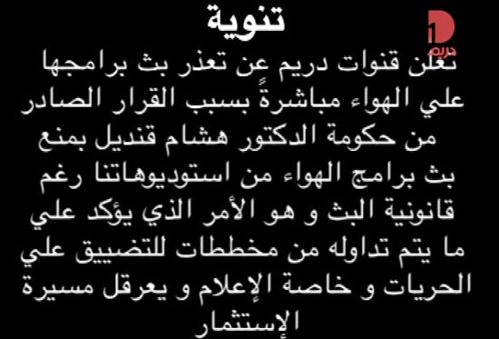 Dream private TV has showed a message saying that they can't continue broadcasting because of the decision of the Egyptian government to stop its broadcasting as Dream studios are located outside Egyptian Media Production City.