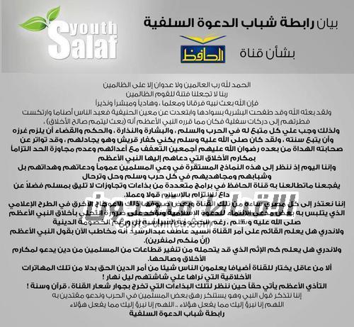 Young people of Salafist Preaching have denounced the attitude and rudeness of the interviews and talk shows aired on Al-Hafiz Islamic television of many Sheiks.