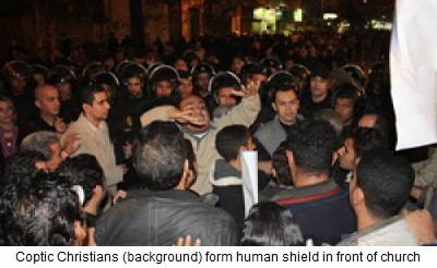 Salafi Muslims began congregating in side streets near the Coptic Church of St. Georges. Christians formed a human shield to prevent them from approaching. Witnesses said the Muslims shot at the church and disappeared into the side streets. According to Father Sourial Younan, the priest of St. Georges Church, the Copts were killed in front of the church by gun shots.