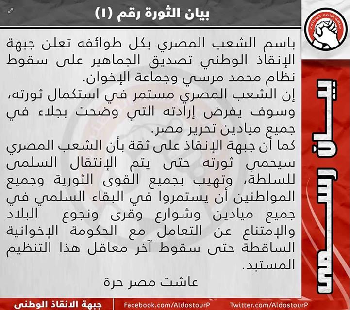 Salvation Front has issued a statement in which it called the Egyptian people not to recognize the government of the Muslim Brotherhood and hold their ground till the regime is overthrown.
