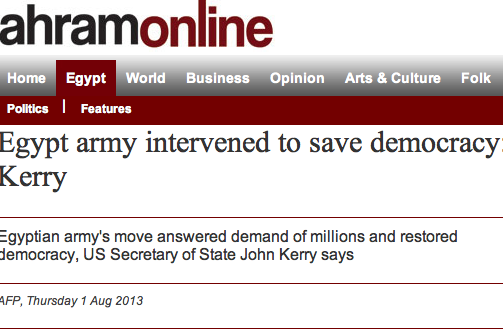 US Secretary of State John Kerry said Thursday the Egyptian army, which deposed president Mohamed Morsi, had intervened at the request of millions to protect democracy and had restored it.