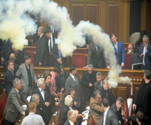 Fighting broke out and smoke bombs were thrown on Tuesday as Ukraine's parliament erupted into chaos as it ratified a bitterly controversial deal with Russia extending the lease of a key naval base.smoke filling the chamber during a parliament sitting in Kiev on Tuesday.