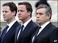 The three party leaders appeared together at the Cenotaph for VE Day celebrations.
