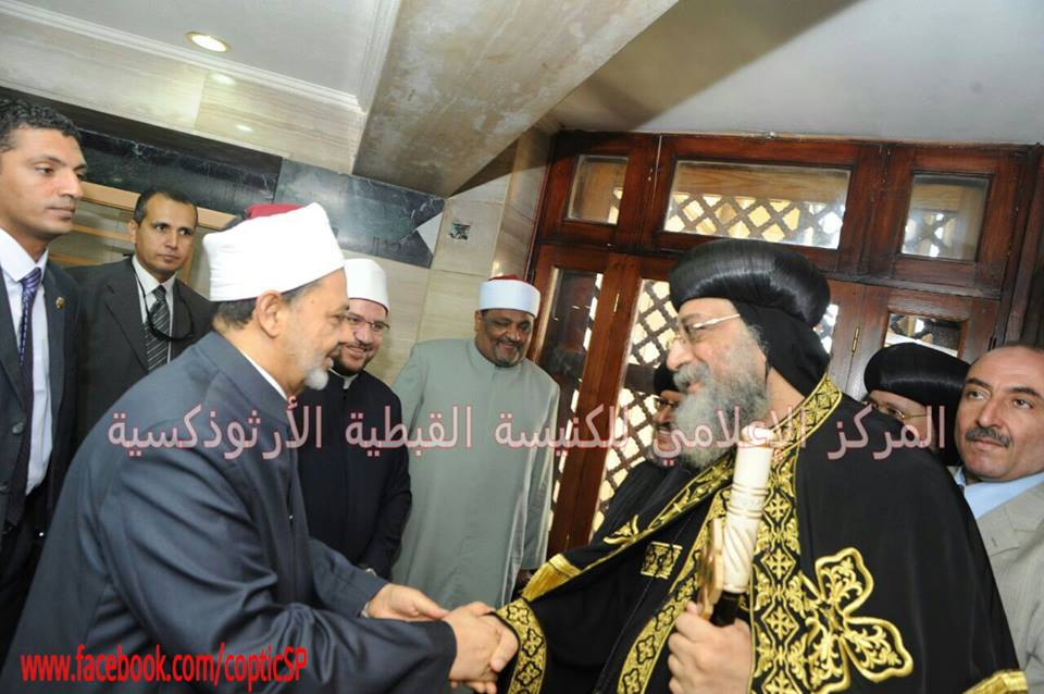 In his meeting today with the Grand Imam of Al-Azhar Sheikh Ahmed al-Tayeb and Dr. Mohamed Mokhtar Gomaa, Minister of Awqaf, Pope Tawadros II said that God loves Egypt and is always protecting her.
