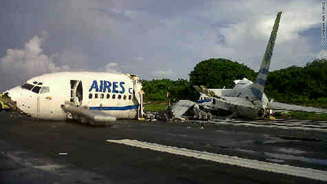 (CNN) -- One passenger was killed when an airplane crashed in bad weather and split into two when landing early Monday on the island of San Andres, Colombia, officials said.