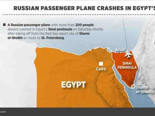 The Russian Embassy in Cairo said it had been told by Egyptian officials the pilot had been trying to make an emergency landing at El-Arish.