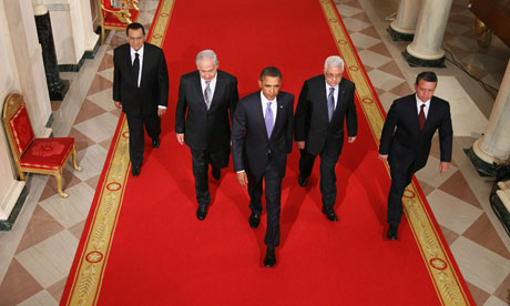 The original photo showed US president Barack Obama walking in the lead on a red carpet, with Israel's prime minister Binyamin Netanyahu, the Palestinian president Mahmoud Abbas, Mubarak and Jordan's King Abdullah II slightly behind.