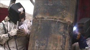 Engineers expect to finish lining the top 100m (330ft) of the escape shaft with metal tubing by about 0900 Monday (1200 GMT), said Mining Minister Laurence Golborne.