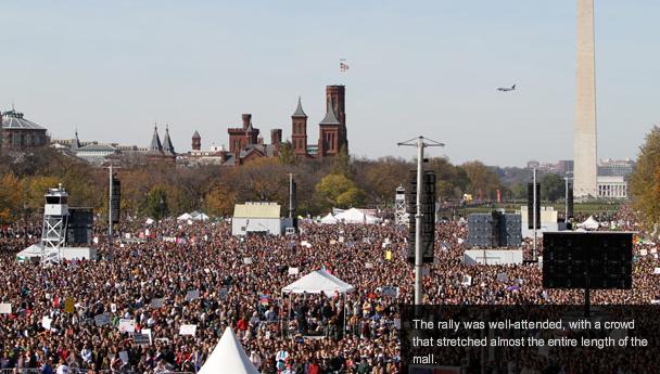 "This was not a rally to ridicule people of faith, or people of activism, or to look down our noses at the heartland, or passionate argument, or to suggest that times are not difficult and we have nothing to fear," Stewart told the crowd as the rally drew to a close. "They are, and we do. But we live now in hard times, not end times. And we can have animus and not be enemies, but unfortunately one of our main tools in delineating the two broke."