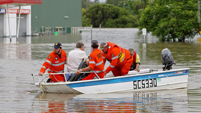 (CNN) -- Australians struggled to keep dry Tuesday after record flooding made many eastern towns look more like vast lakes than residential communities.