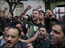 The protests continued throughout Monday, with Copts marching through the area shouting, "With our soul and our blood we will redeem the Holy Cross" and "O Mubarak, the heart of the Copts is on fire".