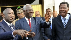 The heads of state travelling to Ivory Coast are Benin's Boni Yayi, Sierra Leone's Ernest Bai Koroma and Cape Verde's Pedro Pires - who represent the Economic Community of West African States (Ecowas).