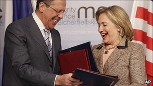 Russian Foreign Minister Sergei Lavrov and US Secretary of State Hillary Clinton exchanged ratification documents at a conference in Munich.