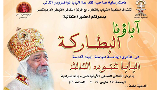The celebration will be held at the Coptic Orthodox Cultural Center at the great Cathedral of St. Mark in Abbassia.