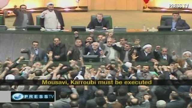 Press TV aired video Tuesday of lawmakers chanting "Moussavi, Karrubi ... execute them."