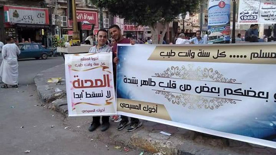 A group of Coptic youth held signs in the streets of Minya governorate to congratulate Muslims on the Adha feast.