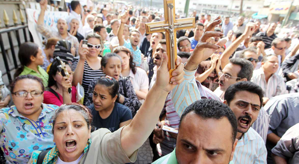 Muslim and Christian protesters gathered in front of Cairo's High Court ahead of a march for national unity in the center of the city when they were pelted with stones by dozens of men from a nearby neighborhood. A security official described them as “neighborhood thugs.”