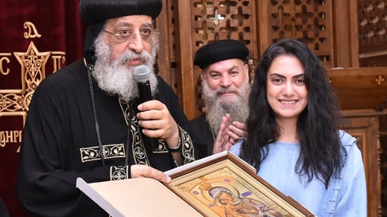 Pope Tawadros II honored Dr. Mirna Hosni, a student of pharmacy at the British University in Egypt who achieved first place over 45 teams, while she stood alone in the competition.
