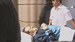A military helicopter landed at the site, carrying Mr Mubarak. State television showed the former president, wearing a blue jumpsuit, being wheeled out of an ambulance on a hospital bed. His son Alaa tried to cover the camera.
