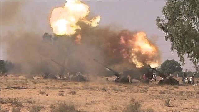 NTC fighters pushed far along the road towards the city centre, outpacing the protection of the artillery and rockets which had been bombarding what was left of the pro-Gaddafi positions.