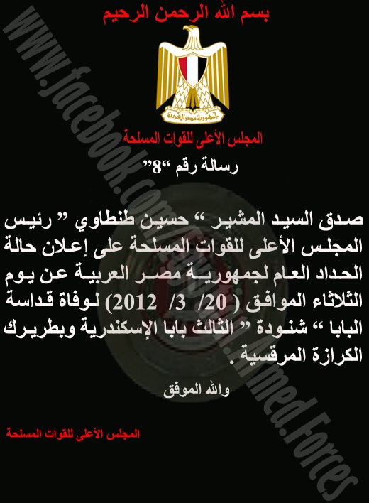 Supreme Council of the Armed Forces (SCAF) issued a statement on its official page on Facebook, declaring the public mourning for the Arab Republic of Egypt tomorrow, Tuesday, March 20th for the death of Pope Shenouda III, Pope of Alexandria and Patriarch of Saint Mark See.