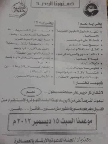 The Commission of advocacy and counseling in Asafra, Alexandria has distributed leaflets calling to vote "yes" in referendum on constitution draft. The Salafist Preaching institute has mentioned in a statement that the vote "yes" in the draft of the constitution is to pave the way for the application of Islamic law and stability, while “no” will spread chaos and instability, and harm Islam in Egypt.