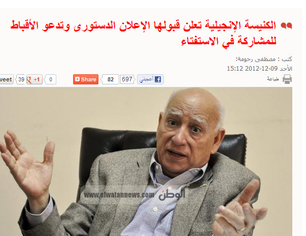 Dr. Rev. Safwat Al-Bayaadi, head of the Evangelical community, told Copts United that the Evangelical Church hasn’t accepted the new Constitutional Declaration or invited the Christians to participate in the referendum on the draft of the constitution.