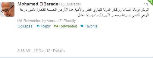 In his latest tweet on Twitter, Mohammed El-Baradei, founder of The Constitution party, said that Egypt is currently divided and the state institutions are collapsing.He added that Islamists are but trading on religion using the high rates of poverty and illiteracy of the Egyptians who understand very well what’s going on, and another revolution is at hand.