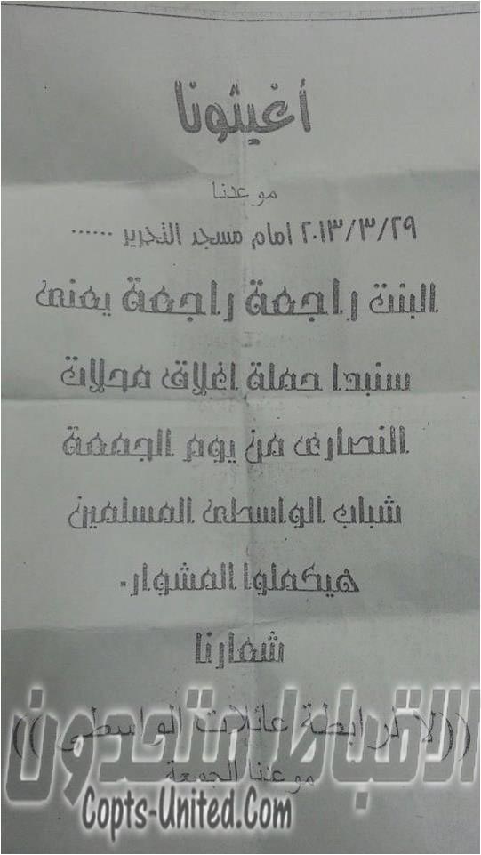 The Salafist Mohammed Mostafa, former MP, said during “Friday speech” that he has nothing to do with closing the shops of the Christians, however he said in the previous speech that Christians shouldn't be able to reopen their shops until the girl returns, even for a year, and Muslim girls shouldn't work for Christians anymore.