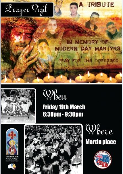 The Diocese of Sydney and its affiliated regions in conjunction with the Youth from the Australian Coptic Movement (ACM) invite you to a prayer vigil which will be held on Friday 19th March 2010 at Martin Place (6.30pm to 9.30pm). The vigil is in the spirit of the upcoming passion week to prepare for the suffering of C...hrist and to remember the modern day martyrdoms that have occured in the name of Christ in Naga Hamadi. We all stand in solidarity with our perescuted brothers and sisters in Egypt.