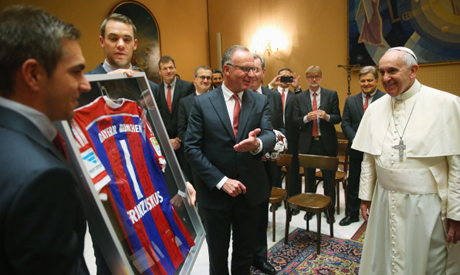 Pope Francis has welcomed the victorious Bayern Munich team to the Vatican after its 7-1 Champions League rout of Roma, telling the players they ''played a wonderful game'' and receiving a signed jersey in return.