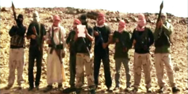 A group of nine men stood in front of the camera in a desert-like place, dressed in army fatigues, with their faces masked by scarves. All were carrying different weapons.