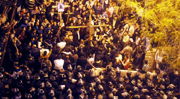 Thousands of disgruntled Copts threw stones and water bottles at security forces when the police tried to forcibly disperse the crowds, yet police managed to end the protest on Monday at dawn.