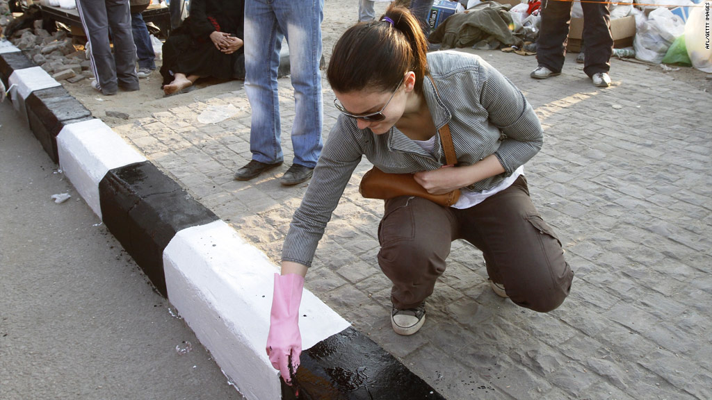 Volunteers repainted black-and-white-striped street curbs around a monument by the Egyptian Museum, which had been on the front line in street battles between Mubarak's foes and supporters. Police were starting to move barricades and trying to restore vehicle traffic at Tahrir Square, where many protesters vowed to remain.