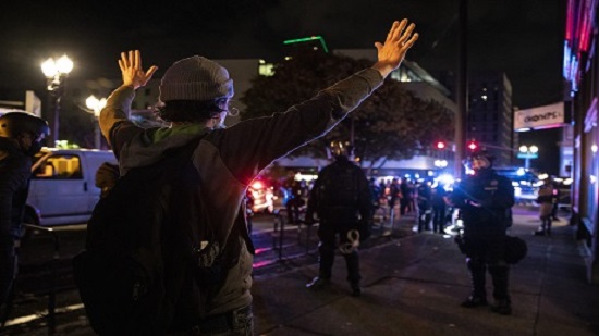 Police in Portland declared riots, arrested 11 people and seized fireworks, hammers and a rifle, as Oregon Governor Kate Brown activated the National Guard in response to protests on the night after voting in the US presidential election.