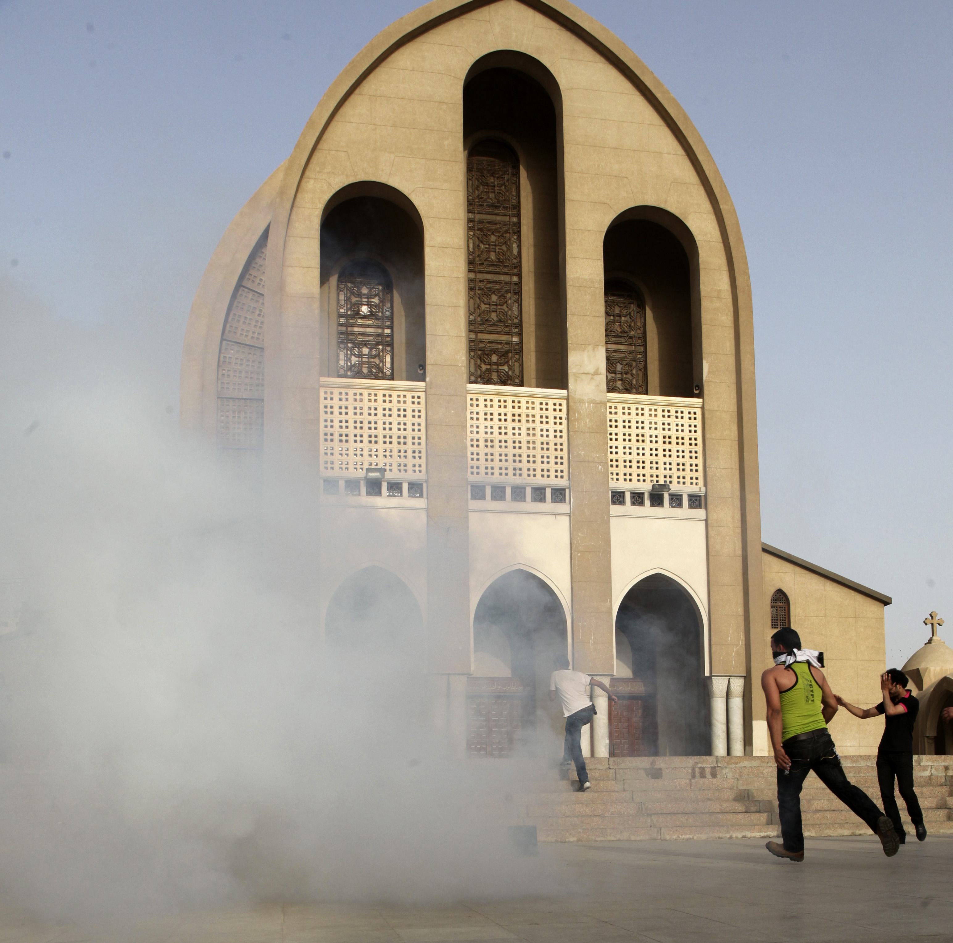 Clashes broke out on Sunday afternoon outside the cathedral as mourners held a funeral for four Christians who were killed in sectarian violence in the town of Khusus, northeast of Cairo, over the weekend.